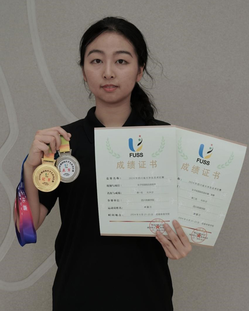在融合媒体学院各级领导的支持下,在教练员马渤和张升宇老师的教导下,在辅导员老师廖思璐的关心下,经过激烈比拼,融合媒体学院2023级网络与新媒体专业7班的龚馨兰同学,在女子自选长拳和自选剑术项目比赛中获得女子校园组自选剑术第一名以及获得女子校园组自选长拳第二名;2023级网络与新媒体专业3班的戢奕娴同学获得女子校园组自选长拳第四名,两位同学用实力诠释了武术的魅力,为学校以及学院争得了荣誉。