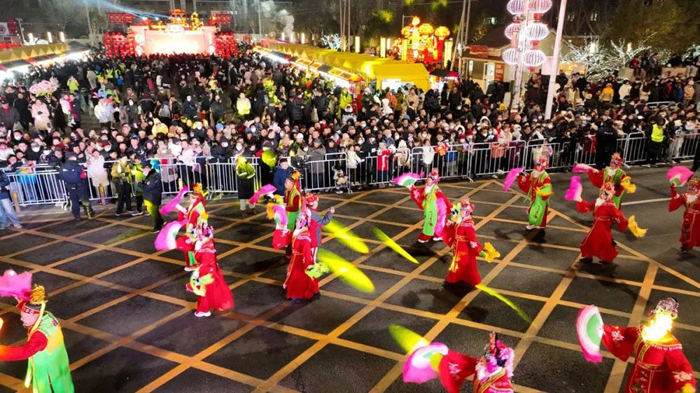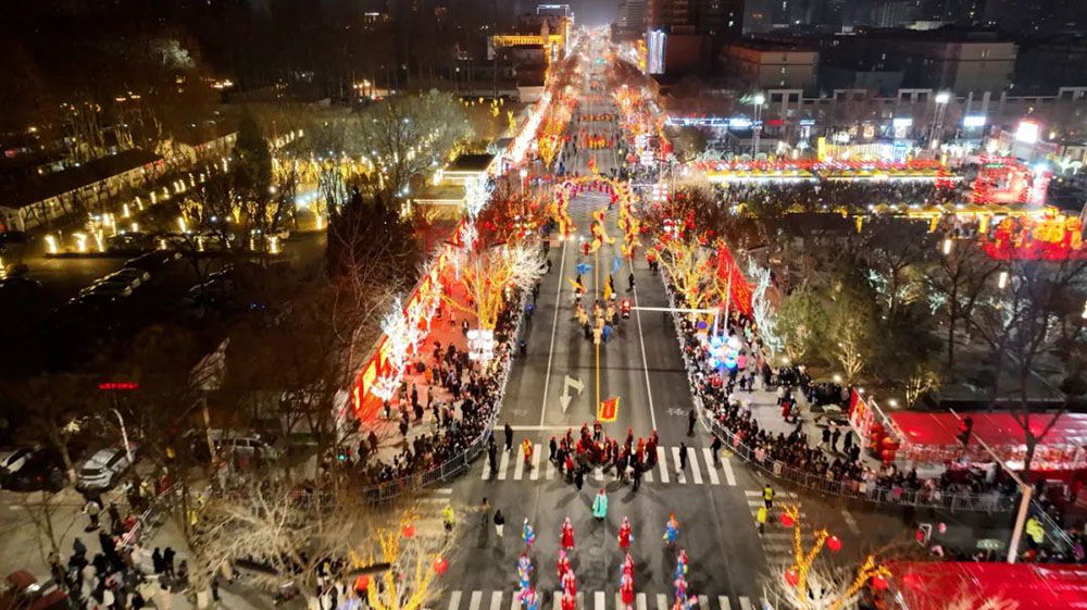 盛典庙会迎春前,锣鼓喧天绚夜天,串串花灯人间照,龙腾跳跃舞固安。