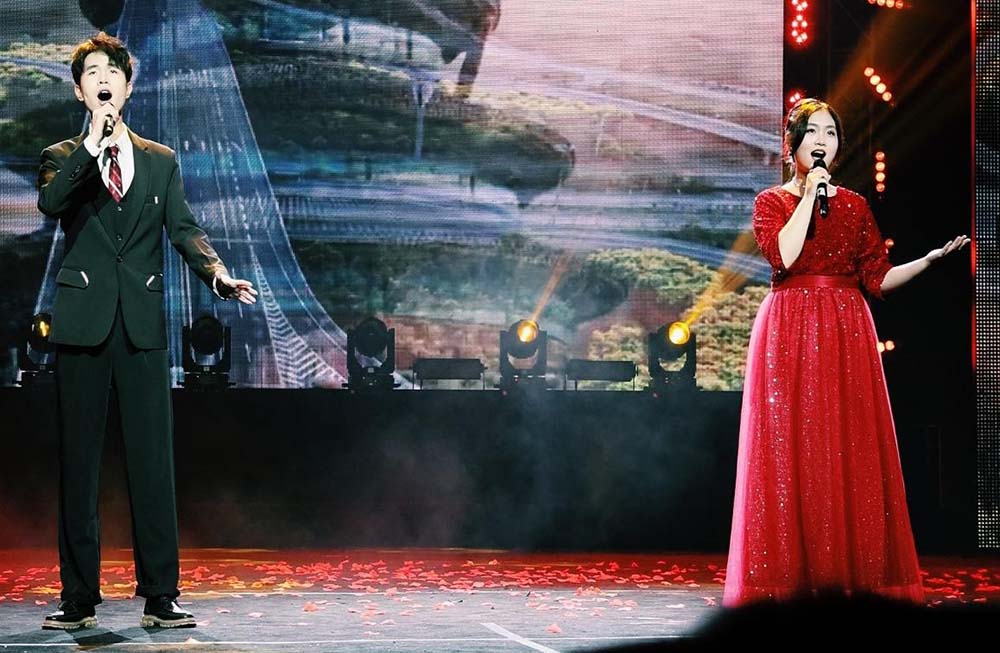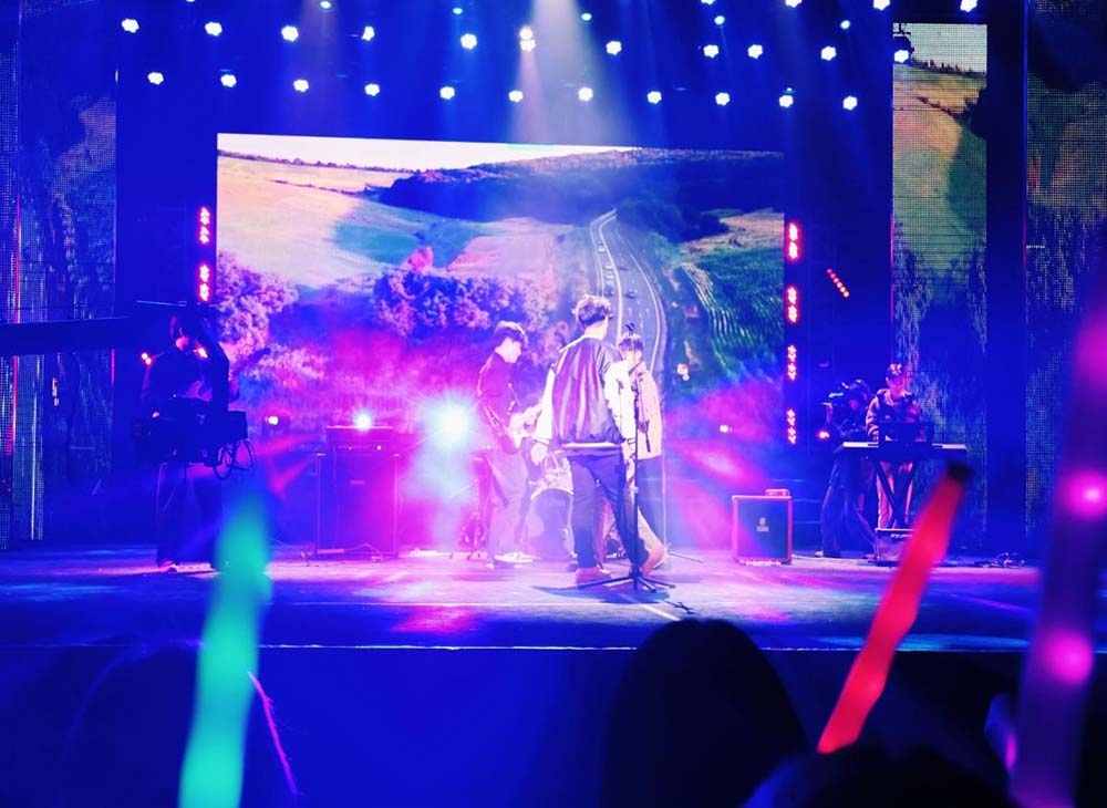 伴随着热情豪迈的乐声响起,在乐器弹唱热场节目《公路之歌+再见杰克》的音符巧妙碰撞中,活动现场欢声四起,蓬勃的青春朝气瞬间燃爆全场,荧光闪动。随即,四位主持人闪亮登场,在简练的开场白后,此次晚会正式拉开帷幕。