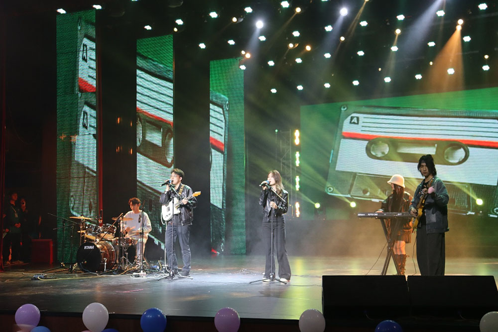 一曲由乐队带来的《梦特别娇+当一切结束时》拉开了晚会的序幕。动感的旋律、激情的演奏瞬间点燃了现场的气氛,师生们挥舞着手中的应援棒,与台上的乐队成员共同沉浸在音乐的海洋中。